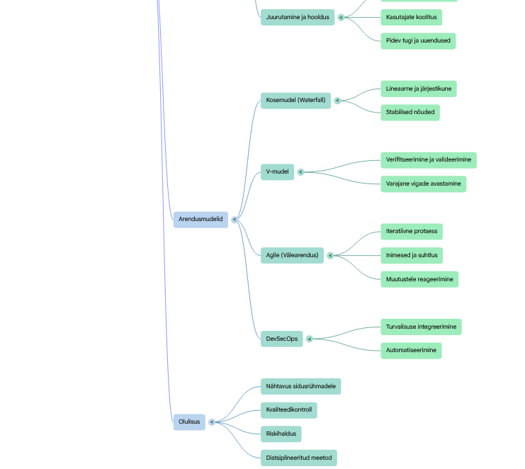 | V-mudel | Kosemudeli laiendus, kus igale arendusetapile vastab konkreetne testimisfaas (verifitseerimine ja valideerimine). | Varajane vigade avastamine tänu varajasele testimise planeerimisele; selge jälgitavus nõuete ja testide vahel. | Jäik ja paindumatu muudatuste suhtes; dokumentatsioonimahukas ja aeganõudev. | Reguleeritud ja ohutuskriitilised valdkonnad (meditsiin, lennundus, pangandus), kus on ranged kvaliteedinõuded. |