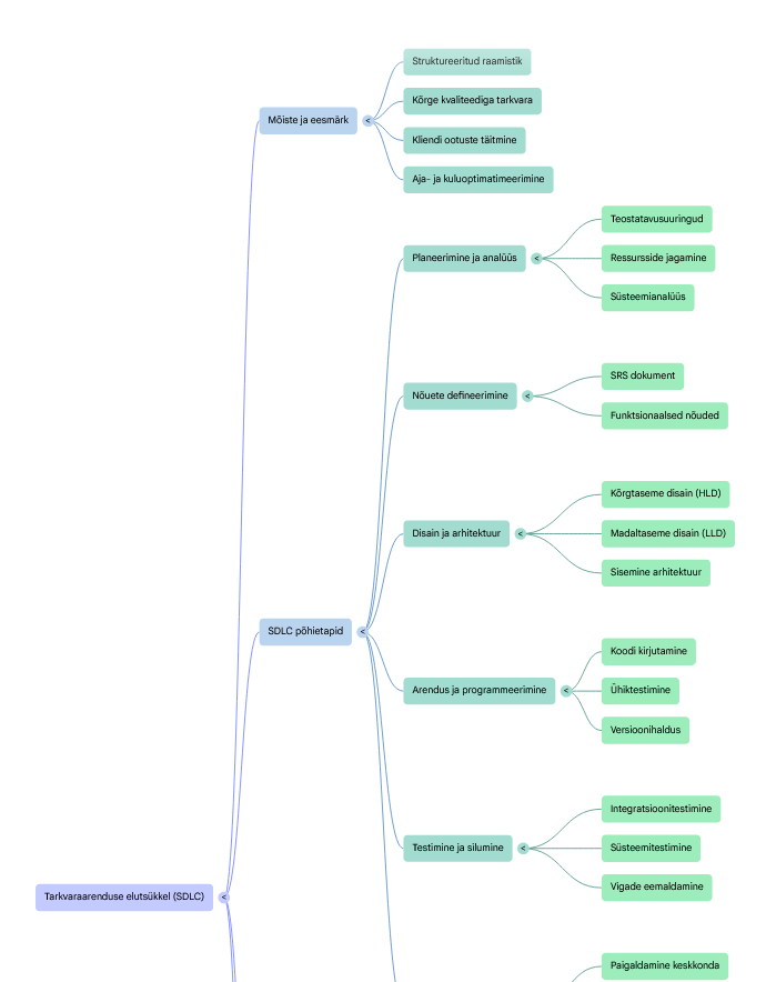 - Planeerimine ja nõuete analüüs: See on vundament, kus määratletakse, mida ja miks ehitatakse. Teostatakse tasuvusanalüüse, eraldatakse ressursse ja koostatakse projekti ajakava ning eelarve.